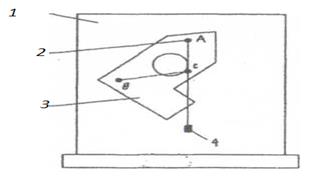 Установка для дослідного визначення координат центру ваги методом підвішування складається з вертикальної стійки 1 (рис. 2), до якої прикріплена голка 2. Плоска фігура З виготовлена з картону, жесті або іншого матеріалу, в якому легко можна проколоти отвір. Отвори А і В проколюються в довільно розташованих точках. Плоска фігура підвішується на голку спочатку в точці А, а потім в точці В. За допомогою підвісу 4, закріпленого на тій же голці, на фігурі підкреслюють олівцем вертикальну лінію, яка співпадає з ниткою підвісу. Центр ваги фігури буде знаходитись в точці перетину вертикальних ліній, нанесених при підвішуванні фігури в точках А і В. Послідовність виконання роботи: 1. Ознайомитись з установкою для визначення центру ваги плоскої фігури. 2. Накреслити фігуру складної форми, яка складається з 3-4 простих фігур і поставити її розміри. 3. Провести осі координат так, щоб вони охопили всю фігуру, розбити складну фігуру на прості частини, визначити площі і координати центру ваги кожної простої фігури відносно вибраної системи координат. 4. Визначити координати центру ваги всієї фігури аналітично. 5. Вирізати дану фігуру з тонкого картону або фанери. Просвердлити два отвори (діаметри отворів повинні бути більші від діаметра голки для підвішування фігури). 6. Підвісити фігуру спочатку в одній точці (отвору), накреслити олівцем лінію, яка співпадає з ниткою підвісу. Те ж повторити при підвішуванні фігури в іншій точці. 7. Зробити отвір в точці перетину проведених ліній - центр ваги фігури. 8. Сумістити фігуру з її зображенням на папері (виконані в однаковому масштабі). Центр ваги фігури, знайдений аналітичним методом, і центр ваги, знайдений дослідним шляхом, повинні співпадати.