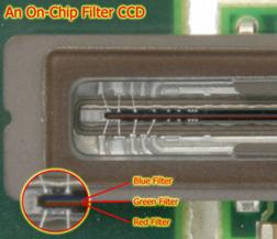 На увеличенной фотографии CCD-матрицы, представленной на рисунке 14, достаточно хорошо видно, что CCD-матрица оснащена собственным RGB-фильтром. Он представляет собой главный элемент системы разделения цветов. Свет можно разделить на его цветовые составляющие, а затем сфокусировать на фильтрах матрицы. Так же элементом системы разделения цветов является объектив сканера, представленный на рисунке 15.