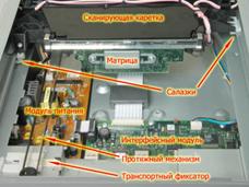 За плотный контакт ремня с шестеренками отвечает специальная натяжная пружина, которая надевается непосредственно на него. Лафет со сканирующей кареткой, изображенный на рисунке 24, перемещается по направляющим салазкам, вдоль корпуса аппарата. Шаговый электродвигатель (Step Motor), изображенный на рисунке 23, может поворачивать шпиндель в обе стороны совсем небольшими шажками. Из-за этой особенности всегда есть возможность переместить каретку сканера на строго определенное расстояние.