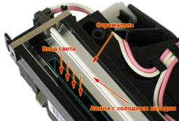 Рисунок 20 – Лампа с холодным катодом Среди очевидных преимуществ лампы с холодным катодом можно отметить большой срок службы, который составляет 5 000 – 10 000 часов. По этой причине в некоторых сканерах не используются отключение лампы после завершения операции сканирования. Кроме этого, лампы не требуют какого-то дополнительного охлаждения и очень дешевы при производстве. Из недостатков - очень медленное включение. Типовое время разогрева лампы от 30 секунд до нескольких минут. Лампа оказывает важное воздействие на результат сканирования. Даже при небольшом уходе характеристик источника света изменяется и падающий на приемную матрицу отраженный от оригинала световой поток. Отчасти поэтому и нужно столь длительное время разогрева лампы перед сканированием. Некоторые драйверы позволяют уменьшить время разогрева, если качество оцифровки не так важно (например, при сканировании текстовой информации). Чтобы как-то скомпенсировать уход характеристик лампы (а это неизбежно происходит при длительной эксплуатации аппарата), сканеры автоматически выполняют процедуру самокалибровки по черно-белой мишени, располагающейся внутри корпуса.