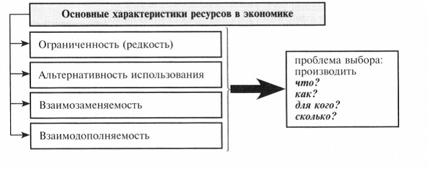 Любой из перечисленных ресурсов является ограниченным, и этот факт очень важен для экономики. Ограниченность ресурсов при удовлетворении неограниченных потребностей ещё называют редкостью. Редкость ресурсов не позволяет производить все продукты и услуги, которые хотело бы иметь общество. Поэтому людям приходится выбирать, какие потребности удовлетворять в данный момент в первую очередь, каким способом использовать имеющиеся ресурсы. Производя намеченные продукты, можно использовать разную технологию, разные способы производства. Кроме этого, произведённые продукты необходимо распределить между людьми, учитывая их разные потребности. В любом случае необходимо делать выбор из разных вариантов. Это относится и к ассортименту производимой продукции, и к технологии производства, и к распределению произведённой продукции. Необходимость выбора следует из факта ограниченности ресурсов, их редкости (рис. 5). Существует множество вариантов того, как использовать ограниченные ресурсы для удовлетворения потребностей. Естественно, что люди стремятся выбрать лучший вариант. Это такой вариант, который в наибольшей степени удовлетворяет наши потребности при наименьших затратах ресурсов. Экономисты называют такой вариант наиболее эффективным вариантом. Выбор наиболее эффективного варианта использования ресурсов в производстве продуктов и услуг - это наиболее общая и в то же время центральная проблема экономики, экономической теории.