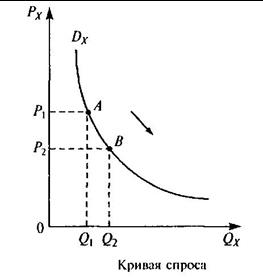 Любому акту купли-продажи предшествует анализ (оценка) двух явлений - спроса и предложения, от состояния которых зависит объем сделок на рынке и уровень цен. При анализе спроса на рынке необходимо различать явления величины спроса и состояния спроса (или просто спроса), так как от этого зависит форма выражения закона спроса и механизм установления равновесной цены. Величина спроса - это желание и способность людей купить определенное количество данного товара по определенной цене при всех прочих равных или неизменных условиях рынка. Цена, которую покупатели предполагают заплатить за данный товар, называется ценой спроса. В основе цены спроса лежит полезность данного товара для покупателя. Спрос (demand - D) - это желание и способность людей покупать товары и услуги при меняющихся ценах и всех прочих условиях рынка, к которым относят цены других товаров, доходы потребителей, количество покупателей и продавцов, их потребности, уровень налогов, политическую ситуацию в стране, степень монополизации рынка и многие другие. Закон спроса - это принцип, в соответствии с которым существует обратная связь между изменением цены (price – p) какого-либо товара и величиной спроса на этот товар при всех прочих равных условиях рынка. Данная зависимость называется кривой спроса. Кривая спроса отражает обратно пропорциональную зависимость между ценой и количеством блага, которое покупатели хотят и могут приобрести в единицу времени (рис.7). Эта зависимость называется законом отрицательного наклона кривой спроса.