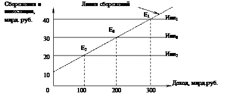Предположим, первоначальный равновесный объем производства (или дохода) при инвестициях в 30 млрд. руб. составляет 200 млрд.руб (рис.33). Если мультипликатор равен 10, то увеличение инвестиций на 10 млрд.руб. (с 30 до 40 млрд.руб.) вызывает прирост дохода на 100 млрд.руб. (с 200 до 300 млрд. руб.). И наоборот, при том же мультипликаторе сокращение инвестиций на 10 млрд.руб. (с 30 до 20 млрд.руб.) вызывает уменьшение объема производства (дохода) на 100 млрд.руб. (с 200 до 100 млрд.руб.).