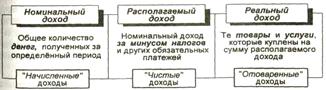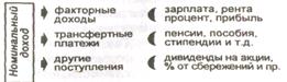 Доход определяется как сумма денежных средств и материальных благ, полученных или произведенных домашними хозяйствами за определенный период времени. Доходы рассматривают на разных уровнях, используя три основных показателя (рис. 1). Рисунок 1 – Основные показатели доходов Структура номинального дохода включает факторные доходы (то есть те, что получены от использования собственных факторов производства, - заработная плата, рента, процент, прибыль); выплаты и льготы по линии государственных социальных программ (трансфертные платежи); плюс другие поступления - проценты по вкладам в банки и облигациям, дивиденды на акции, страховые суммы, лотерейные выигрыши и прочее (рис. 2).