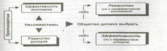 Рисунок 4 – Противоречие между равенством и эффективностью в рыночной экономике Сталкиваясь с этим противоречием, каждое общество должно решить для себя два главных вопроса: 1. В чём оно видит социальную справедливость: в равном распределении доходов или в равных возможностях их зарабатывания? 2.Что лучше: больший пирог, но разделённый на неравные порции (то есть эффективная экономика, но неравенство в обществе); или всем поровну, но уже от меньшего пирога (то есть равенство, но при неэффективной экономике)? Социальная политика государства – направление его деятельности по регулированию социально-экономических условий жизни общества, которое заключается в обеспечении условий для повышения благосостояния, уровня жизни членов общества, создании социальных гарантий в формировании экономических стимулов для участия в общественном производстве. Государственная социальная политика предусматривает решения следующих задач: 1. Обеспечение равных возможностей при реализации права на образование и долю в общественном благосостоянии путем справедливого распределения доходов и имущества (капитала). 2. Уменьшение нежелательных, обусловленных рынком различий между богатыми и бедными при возникновении доходов и капитала. 3. Обеспечение большей свободы, справедливости, уважения достоинства человека, обеспечение развития личности, активного участия в общественной жизни и права на долю ответственности перед обществом. Главное звено в социальной политике государства занимает политика формирования доходов населения. Она определяется как перераспределение их через государственный бюджет путем дифференцированного налогообложения различных групп получателей доходов и социальных выплат. Согласно другому мнению, составляющими государственного регулирования доходов являются: организация социальных трансфертных платежей и установление определенных цен для производителей и покупателей. Кроме того, законодательным путем устанавливаются минимальные ставки заработной платы, осуществляется государственное пенсионное обеспечение и различные виды социального страхования; производится индексация доходов. Для перераспределения доходов используются такие регуляторы, как прогрессивное налогообложение, при котором налоговая ставка увеличивается по мере роста размеров номинального дохода, социальные трансферты, регулирование цен на социально-значимую продукцию, индексация фиксированных доходов и трансфертных платежей при определенном уровне инфляции, установлении минимального уровня оплаты труда. Наиболее важным и универсальным средством преодоления бедности являются механизмы перераспределения доходов через систему «налогообложение - социальные льготы». Политика выравнивания распределения доходов может быть ориентирована на социальную поддержку низко доходных групп населения либо на ограничение доходов высокодоходных групп. Лучше всего, когда такая политика сочетает в себе оба эти принципа. Первостепенной задачей является обеспечение адекватных пособий по бедности наиболее уязвимым слоям населения, в особенности занятому малоимущему населению. Одной из форм такой поддержки являются пособия по безработице. Но бороться с бедностью необходимо не только за счет социальных трансфертов, сколько за счет помощ