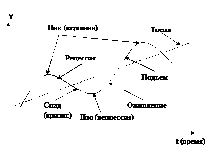 Рис. 2 – Экономический цикл и его фазы Пик, или вершина цикла деловой активности, является «высшей точкой» экономического подъема. В этой точке безработица теоретически достигает самого низкого уровня либо исчезает совсем, а экономика функционирует с максимальной или близкой к ней нагрузкой, то есть в производстве задействуются практически все имеющиеся в стране капитальные и трудовые ресурсы. Обычно, хотя и не всегда, во время пиков усиливается инфляционное давление. Спадом называют период сокращения объемов производства и снижения деловой активности. Вследствие падения конъюнктуры спад обычно характеризуется ростом безработицы. Большинство экономистов полагают, что официально экономическим спадом, или рецессией, можно считать лишь падение деловой активности, которое продолжается по меньшей мере шесть месяцев. Дном экономического цикла является «низшая точка» производства и занятости. Считается, что достижение дна предвещает скорый конец спада, так как данная фаза цикла обычно не бывает продолжительной. Однако история знает и исключения из этого правила. Великая депрессия 1930-х годов, несмотря на периодические колебания деловой активности, длилась почти десять лет. После достижения низшей точки цикла наступает фаза подъёма, которая характеризуется ростом занятости и производства. Многие экономисты полагают, что данной стадии присущи невысокие темпы инфляции, по крайней мере до тех пор, пока экономика не начнет функционировать на полную мощность, то есть пока не достигнет пика. Экономический цикл часто ассоциируется с изменениями объема производства. Многие экономисты полагают, что объем производства, обычно измеряемый валовым внутренним продуктом (ВВП), является самым надежным показателем состояния экономики. Важно отметить, что экономический цикл в фазе подъёма проявляется не в росте ВВП как таковом, а в темпах этого роста. Отрицательные значения темпа роста в течение определенного периода времени, как правило шести и более месяцев, рассматриваются как признак спада в экономике. Напротив, неизменно высокие из месяца в месяц темпы роста свидетельствуют о том, что экономика переживает бум. Стабилизационная (антициклическ