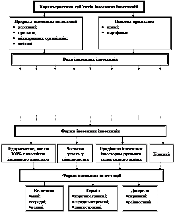 Іноземні інвестиції мають різну інвестиційну природу і цільову орієнтацією, різні види і форми, величину, терміни і джерела (рис. 6.2).