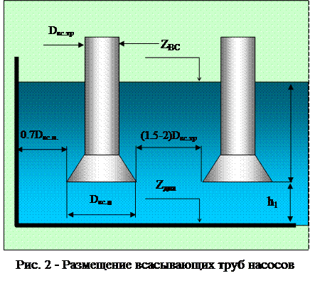 Входные отверстия всасывающих трубопроводов насосов должны быть заглублены под минимальный уровень воды в приёмном отделении колодца в аварийном режиме работы. Если заглубление будет недостаточным, то возле входных отверстий образуются воронки, через которые во всасывающие трубы проникнет воздух, что вызовет срыв работы насосов (см. рис.2).