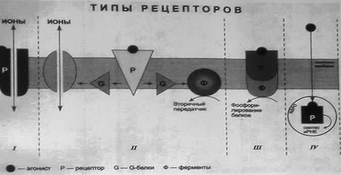 Трансмембранное рецепторы связанные с иоными каналами. При взаимодействии лиганта с рецепторной субъединицей проницаемость ионного канала меняется. (Н-холинорецептор связан с Na-каналом, ГАМК-рецептор - с Cl). Трансмембранные, связанные с G - белками. При взаимодействии с лигантом передается сигнал на внутримембраный G- белок который изменяет активность эффекторных белков на внутренней стороне мембраны, которые являются «вторичными посредниками» (аденилатциклаза, гуанилатциклаза) образуется цАМФ, цГМФ, IРЗ. Трансмембранные рецепторы ферменты - рецептор на наружной стороне мембраны, а каталитическая часть прошивает мембрану насквозь (тирозинкиназы, серинкиназы, цистеинкиназы). Рецепторы интерлейкинов. Цитоплазматические рецепторы - находятся в цитозоле клетки. Лигант связывается с цитозолем, высвобождается рецептор, активированный рецептор взаимодействует в ядре клетки, и регулирует экспрессию генов.