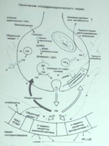 В норадренергических и дофаминергических синапсах под влиянием импульса.происходит деполяризации пресинаптической мембраны, активный входи накопление ионов кальция высвобождается медиатор из связанного комплекса и происходит переход лабильной фракции в цитоплазму и синаптическую щель. После взаимодействия с адренорецептором на постсинаптической мембране значительная часть попавшего в синапс медиатора с помощью специального, активного транспортного механизма, локализованного в пресинаптических окончаниях, возвращается обратно и депонируется в везикулах (обратный нейрональный захват).
