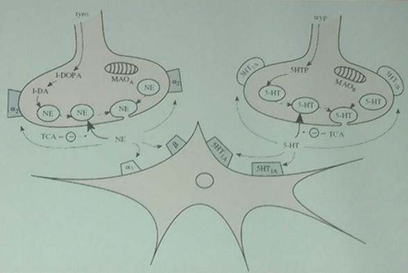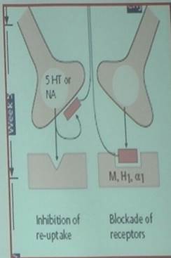 Имипрамин, амитриптилин относятся к группе трициклических антидепрессантов, которые обладают антидепрессивными и седативными свойствами. Седативные свойства наиболее выражены у амитриптилина. Имипрамин на фоне угнетенного настроения может оказывать психостимулирующее действие. Прием имипрамина способствует улучшению настроения, к психостимуляции. Амитриптилин является одним из наиболее эффективных препаратов. Антидепрессивное действие у амитриптилина сочетается с выраженным седативным эффектом, значительной холиноблокирующей активностью и антигистаминными свойствами. Ингибируя обратный нейрональный захват моноаминов, преимущественно норадреналина и серотонина, препарат ослабляет или устраняет тревогу и депрессивные проявления. Применяется при эндогенных депрессиях, тревожно-депрессивных и невротических состояниях. Избирательные ингибиторы нейронального захвата серотонина -пароксетин, флуоксетин, сетралин, тианептин Механизм антидепрессивного действия препаратов этой группы связан с усилением серотонинергической активности в ЦНС, в результате ингибирования обратного захвата серотонина в нейронах мозга. Основное отличие от неизбирательных ингибиторов обратного захвата моноаминов отсутствие холиноблокирующегодействия, незначительное влияние на альфа-АР и гистаминовые рецепторы, что приводит к снижению побочных эффектов, связанных с блокадой этих рецепторов. Флуоксетин применяется для лечения разных видов депрессий, но особенно эффективен при депрессиях сопровождающихся страхом. Сетралин - более выражена способность блокировать обратный захват серотонина, применяется для лечение тяжелых депрессивных состояний. Пароксетин преимущественно блокирует обратный нейрональный захват серотонина, что приводит к усилению серотонинергических влияний в ЦНС. Считается, что он наиболее сильный ингибитор обратного захвата серотонина из всех известных препаратов с подобным механизмом действия. Показаниями для применения пароксетина являются тяжелые депрессивные расстройства. Тианептин — антидепрессант с анксиолитическими свойствами, повышает обратный нейрональный захват серотонина нейронами коры головного мозга и гиппокампа. На обмен дофамина и норадреналина в ЦНС влияет относительно слабо. Тианептин нормализует поведение, улучшает сниженное настроение и уменьшает соматические симптомы, способствует восстановлению нормального физиологического сна, улучшает концентрацию внимания, не оказывает отрицательного влияния на память, не подавляет либидо. К препарату не развивается привыкания. Применяется для лечения депрессивные состояния невротического и реактивного происхождения, тревожно-депрессивные состояния с соматическими жалобами и у больных хроническим алкоголизмом. В последние годы появились эффективные антидепрессанты с другими механизмами действия: Миртазапин - блокирует пресинаптические а2-адренорецепторы в адренергических и серотонинергических синапсах, в результате чего увеличивается высвобождение норадреналина и серотонина из окончаний нервных волокон, особенностью миртазапина является то, что выделившийся в результате стимуляции а-2адренорецепторов серотонин стимулирует лишь 5НТ1, рецепторы, благодаря чему развивается антидепрессивный эффект, в то время как 5