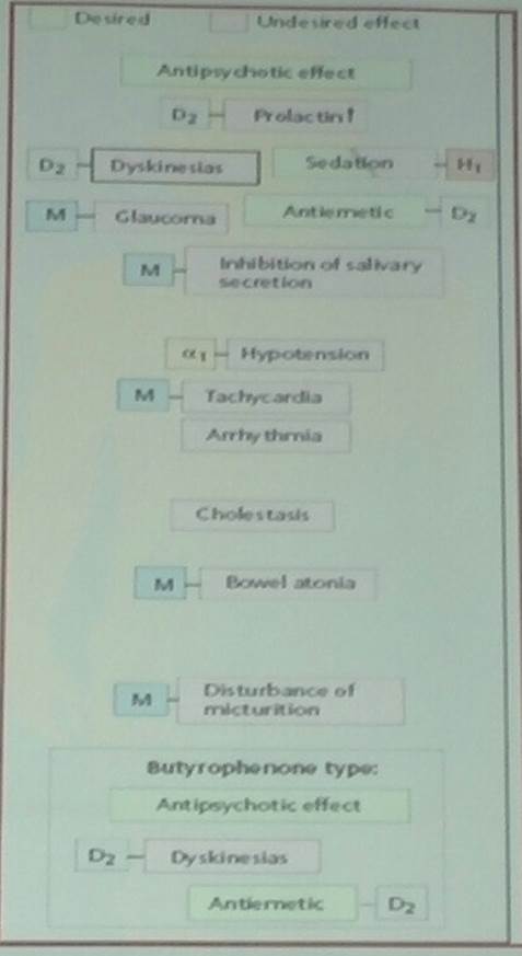 Психотропный эффект - подавление бреда, галлюцинаций, страха и агрессивности. Нейролептический эффект - развивается эмоциональное безразличие. Снотворное действие - снижение симптоматики тревоги страха, улучшение настроения Нейротропный эффект - снижение тонуса скелетных мышц. Прочие эффекты: гипотензивный эффект (блокада АД-рец и 5-ОТ-рец в гипоталамусе, гипотермический эффект - увеличение теплоотдачи. Показания к применению: · Острые и хронические психозы (при шизофрении, белой горячке интоксикационные психозы) психомоторное возбуждении · Купирование и профилактика обострений при шизофрении · Нейролептанальгезия, премедикация · Неукротимая рвота, в том числе рвота связанная с наркозом, радиацией, беременностью. Хлорпромазин является эталонным (базисным) представителем нейролептиков. Препарат оказывает антипсихотическое, выраженное седативное, а также анксиолитическое действие. Антипсихотическое действие препарата в основном связано с его способностью устранять бред и галлюцинации у больных шизофренией и другими психозами, что реализуется путем блокады постсинаптических Д2рецепторов в мезолимбической системе. Седативное действие связано с угнетающим влиянием хлорпромазина на восходящую ретикулярную формацию ствола мозга вследствие блокады альфа-адренорецепторов, проявляется общим успокоением, устранением аффективных реакций, понижением двигательной активности при эмоциональном, психическом и двигательном возбуждении. Анксиолитическое действие проявляется в снижении страха, тревоги, беспокойства, психической напряженности.