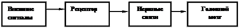 Функциональная система включает в себя: – рецепторы, являющиеся своеобразными живыми датчиками, оценивающими величину регулируемого показателя; – центральный аппарат – структуры мозга, анализирующие все многообразие поступающих сигналов, принимающие решение и программирующие ожидаемый результат; – поступающие команды. – исполнительные механизмы – периферические органы, реализующие поступающие команды. Кроме того, в системе есть обратная связь, которая информирует центр об эффективности деятельности исполнительных механизмов и о достижении конечного результата. В зависимости от специфики принимаемых сигналов различают следующие анализаторы: Внешние – зрительный (рецептор – глаз), слуховой (рецептор – ухо), тактильный, болевой, температурный (рецептор – кожа), обонятельный (рецептор в носовой полости), вкусовой (рецепторы на поверхности языка и неба). Внутренние – анализатор давления, кинестетический (рецепторы в мышцах и сухожилиях), вестибулярный (рецептор в полости уха), специальные, расположенные во внутренних органах и полостях тела.