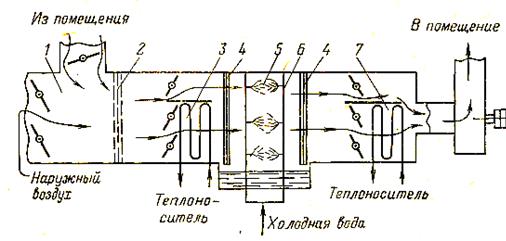 Наиболее совершенная система искусственной вентиляции, при которой автоматически поддерживаются заданные параметры микроклимата, – это кондиционирование воздуха. Промышленностью выпускаются местные кондиционеры для обслуживания сравнительно небольших по объему помещений и центральные (рис. 7) для обслуживания нескольких помещений. Наружный воздух и частично воздух из помещения поступают в камеру 1, где смешиваются и затем очищаются от пыли в фильтре 2. При необходимости (зимой) воздух подогревается в калорифере 3. Охлаждение (летом) и увлажнение воздуха осуществляется в камере 6 с помощью форсунок 5, в которые подается холодная вода. После осушения воздуха в каплеотделителе 4 его температуру доводят во вторичном калорифере 7 до нормативного значения. Автоматические устройства, регулирующие температуру, влажность и скорость подачи чистого воздуха, воздействуют по заданной программе на соответствующие клапаны – регуляторы, установленные в камере 1, в калориферах, на форсунках холодной воды.
