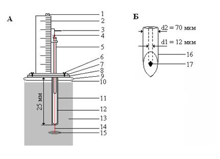 Рис. 2.1. Схема микроманипулятора (А) и микроэлектрода (Б). 1 – подающий винт; 2 – корпус микроманипулятора с миллиметровой шкалой; 3 – разъем для подключения предварительного усилителя; 4 – контактная площадка для микроэлектрода; 5 – внутренняя направляющая микроманипулятора; 6 – винты для крепления; 7 – платформа микроманипулятора; 8 – опорная площадка канюли; 9 – быстротвердеющая пластмасса; 10 – кость черепа; 11 – наружная направляющая микроманипулятора; 12 – канюля, введенная в мозг животного; 13 – мозг; 14 – микроэлектрод; 15 – структура-мишень; 16 – стеклянная изоляция микроэлектрода; 17 – серебряный микропровод.