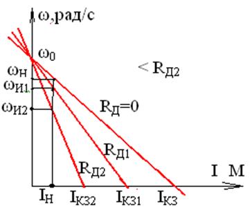 1.Скорость идеал. хол. хода (ω 0) 2.Режим к.з - Т.к - Т.к статическая ошибка - Ток к.з, и момент будет уменьшатся с увеличением Rд - С увеличением сопротивления в цепи якоря частота вращения дв-я под нагрузкой будет уменьшаться в двигательном режиме