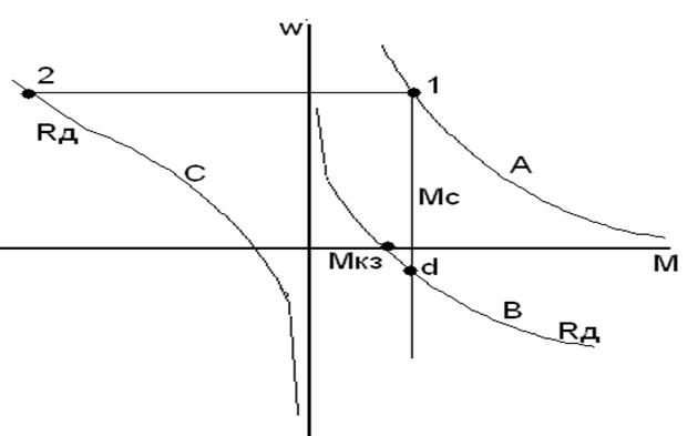 Где A- естественная характеристика B – искусственная характеристика когда Мкз< Мс С- характеристика против включения Mc – момент нагрузочный. C-симметрична В. Случай первый - когда Мкз< Мс (получается при ведении в якорную цепь Rд). Так как Мкз стал меньше момента Мс, то он начнет сначала тормозиться затем разгоняться противоположном направлении, до точки d в этот момент нагрузка Мс и ДПТ сравняется и двигатель войдет в режим противовключения Случай второй - когда нагрузка меняется скачкообразно (Мс; -Мс) 1-2 проходит в два этапа: 1-2квадрант торможение противовключением скорость падает до 0; 2-3 квадрант двигатель крутиться в другом направлении