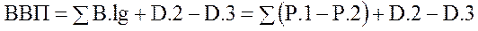 B.lg = P.1 – P.2, де ВВП — обсяг валового внутрішнього продукту; B.lg — валова додана вартість; P.1 — випуск продукції; P.2 — проміжне споживання; D.2 — податки на виробництво та імпорт; D.3 — субсидії (–). Схема обчислення ВВП виробничим методом дає змогу крім отримання його абсолютної величини розрахувати його структуру (питома вага валової доданої вартості, створеної в кожній галузі (виду економічної діяльності), у загальному обсязі ВВП), а також визначити вв кожній галузі економіки (виду економічної діяльності) питому вагу проміжного споживання та валової доданої вартості у валовому випуску товарів і послуг, що, до речі, є однією з основних пропорцій економічного розвитку будь-якої країни, яка може свідчити про позитивні (зменшення питомої ваги проміжного споживання в обсязі валового випуску свідчить про зменшення матеріаломісткості виробництва) або негативні тенденції в економіці країни. Відповідно до розподільчого методу ВВП розраховується на стадії формування доходів і визначається як сума доходів: D.1 — оплата праці найманих працівників; D.2 — податки на виробництво та імпорт; D.3 — субсидії (–); B.2/B.3 — прибуток та аналогічні доходи / змішаний дохід. Подамо ВВП за допомогою рівняння: ВВП = D.1 + D.2 — D.3 + B.2/B.3. Дані цього методу допоможуть узгодити доходи з досягнутими результатами діяльності за секторами й галузями (видами економічної діяльності), розрахувати показники доходів і виробництва продукції та надання послуг на одного зайнятого. Згідно з методом кінцевого використання на стадії кінцевого використання виробленого продукту ВВП виступає як кінцеві споживчі витрати, валове нагромадження основного капіталу, зміна запасів матеріальних оборотних коштів, придбання, за винятком вибуття цінностей, та чистий експорт. ВВП подамо за допомогою рівняння: ВВП = P.3 / P.4 + P.51 + P.52 +P.53 +P.6 – P.7, де P.3 / P.4 — витрати на кінцеве споживання / фактичне кінцеве споживання; P.51 — валове нагромадження основного капіталу; P.52 — зміни в запасах матеріальних оборотних засобів; P.53 — придбання мінус вибуття цінностей; P.6 — експорт товарів і послуг; P.7 — імпорт товарів і послуг.