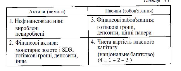Баланс активів і пасивів має форму двосторонньої таблиці, у лівій частині якої фінансові та нефінансові активи, у правій - фінансові зобов'язання. Перевищення вартості активів (вимог) над величиною фінансових зобов'язань представляє собою чисту вартість власного капіталу. Схема балансу активів і пасивів на початок (кінець) періоду наведена в табл. 3.1. Баланси активів і пасивів складаються за секторами і галузями економіки і в цілому по економіці. Балансувальною статтею зведеного балансу активів і пасивів є національне багатство. Отже, обсяг національного багатства можна визначити за даними балансу активів і пасивів як різницю вартостей усіх економічних активів і фінансових зобов'язань.
