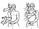 1. Обезболивание: наркотики + местная анестезия (или внутривенный наркоз). 2. Больного усадить на табурет или уложить на перевязочный стол. 3. Стать со стороны вывиха лицом к голове больного. 4. Фиксировать плечевой пояс больного полотенцем или простыней, перекинутой через подмышечную область с больной стороны (концы полотенца или простыни с противоположной стороны удерживает помощник). 5. Фиксировать правой рукой правое предплечье больного в области лучезапястного сустава. 6. Согнуть правую руку больного в локтевом суставе под углом 900. 7. Захватить сверху левой рукой правое предплечье больного в верхней трети его (у локтевого сустава). Оттянуть правое плечо больного по направлению продольной оси его книзу. 8. Прижать правое плечо больного к туловищу (1-й этап). 9. Ротировать (медленно!) кнаружи прижатое к туловищу правое плечо больного с помощью согнутого под прямым углом предплечья не снимая тяги вниз до тех пор, пока ладонная поверхность правого предплечья больного не приблизится к фронтальной плоскости туловища (2-й этап). При вправлении слышен щелчок. 10. Привести локтевой сустав вывихнутой руки к средней линии туловища больного, не ослабляя вытяжения, приведения локтя к туловищу и ротации плеча кнаружи (3-й этап). 11. Резко забросить правую кисть больного на его левое надплечье (4-й этап). 12. Проверить (осторожно!) восстановление движений в правом плечевом суставе больного, путем легких пассивных движений в нем. Контроль: шарообразная форма сустава, головка плеча не пальпируется в подмышечной области. Пульс на правой лучевой артерии сохранен. 13. Иммобилизовать правую верхнюю конечность повязкой Дезо или задней гипсовой лонгетой от пальцев кисти до противоположной лопатки с фиксацией предплечья косыночной повязкой. 14. Выполнить контрольный рентгенснимок плечевого сустава и проанализировать его (полное сопоставление суставных поверхностей лопатки и плеча)