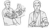 Рис. 13. Транспортная иммобилизация предплечья: Лестничную шину длиной 80 см, обернутую серой ватой и бинтами, сгибают под прямым углом на уровне локтевого сустава таким образом, чтобы верхний конец шины находился на уровне верхней трети плеча, участок шины для предплечья изгибают в виде желоба. Затем прикладывают к здоровой руке и исправляют недостатки моделирования. Подготовленную шину накладывают на больную руку, прибинтовывают на всем протяжении и подвешивают на косынку.