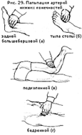 Определение пульсации передней больше-берцовой артерии проводится на тыле стопы между I и II плюсневыми костями, задней большеберцовой артерии - между задним краем внутренней лодыжки и ахилловым сухожилием.