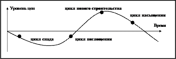 Цикличность рынка недвижимости представляет собой классический цикл – сочетание экономических спадов и подъемов. Различные сегменты рынка ведут себя по-разному в одно и то же время. Например, строительство в одной части города может быстро расти в цене, тогда как в то же самое время в другой ее части наблюдается застой. Характеристика циклов рынка недвижимости: А. Цикл спада. Наблюдается тогда, когда рынок перенасыщен, и число незанятых строений начинает увеличиваться. Этот рынок – рынок покупателя. Владельцу недвижимости требуется приложить интенсивные усилия в области маркетинга и поиска финансовой поддержки. На рынке появляется небольшое число новых объектов. Кредиторы практически приостанавливают свои операции до нового подъема, а цены на недвижимость снижаются. Б. Цикл поглощения. Из-за отсутствия нового строительства, являющегося результатом цикла спада, начинает набирать силу спрос на рынке недвижимости. Рынок переходит в новый цикл – цикл поглощения созданного объекта. После того как инвестиционные излишки будут поглощены, рентные ставки начнут расти. В соответствии с возрастанием спроса и уменьшением предложения начинают проводиться прединвестиционные исследования по созданию новых объектов недвижимости. В. Цикл нового строительства. Циклу нового строительства соответствует повышенный спрос на рынке объектов строительства наряду с сокращением предложений на свободные земельные участки. Рентные ставки увеличиваются вместе с ценой на недвижимость. В этот период повышается уровень инфляции, и стоимость строительства возрастает, что увеличивает продажную цену объекта недвижимости. Г. Цикл насыщения рынка. Рост продаж недвижимости происходит медленными темпами и в итоге сокращается. Возникает излишек готовой строительной продукции и мощностей. Уровень занятости начинает уменьшаться, а строительная деятельность постепенно останавливается. Наилучшее время для увеличения объектов собственности – это стадия цикла поглощения или периода нового строительства.