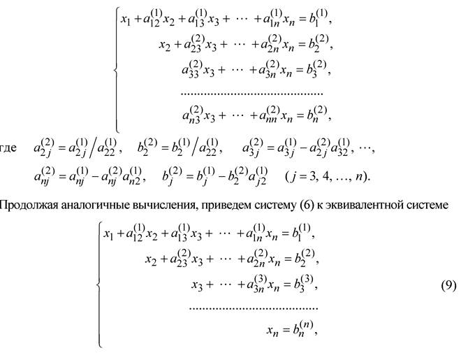 for i: =k+1 to n do for j: =k to n+1 do begin if j=k then aik: =a[i, k]; a[i, j]: = a[i, j] - (aik/a[k, k]) * a[k, j]; end; writeln(' К-ты системы после ', k, '-го шага преобразования'); for i: =1 to n do for j: =1 to n+1 do begin if j=n+1 then writeln(' a(', i, ', ', j, ')=', a[i, j]: 8: 3) else write(' a(', i, ', ', j, ')=', a[i, j]: 8: 3); end; end; {------------------- Обратный ход метода Гаусса -----------------} x[n]: =(a[n, n+1])/a[n, n]; writeln; writeln(' Корни системы: '); writeln(' x[', n, ']=', x[n]: 8: 3); for k: =n-1 downto 1 do begin r: =0.0; l: =k+1; repeat r: =r+a[k, l]*x[l]; l: =l+1 until l> n; {------------ Корни системы---------} x[k]: =(a[k, n+1]-r)/a[k, k]; writeln(' x[', k, ']=', x[k]: 8: 3); end; writeln; readkey; end.