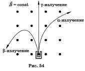 Радиоактивность — это испускание ядрами некоторых элементов различных частиц, сопровождающееся переходом ядра в другое состояние и изменением его параметров. Явление радиоактивности было открыто опытным путем французским ученым Анри Беккерелем в 1896 г. для солей урана. Беккерель заметил, что соли урана засвечивают завернутую во много слоев фотобумагу невидимым проникающим излучением. Английский физик Э. Резерфорд исследовал радиоактивное излучение в электрических и магнитных полях и открыл три составляющие этого излучения, которые были названы а-, B-, у-излучением (рис. 54). а-Распад представляет собой излучение а-частиц (ядер гелия) высоких энергий. При этом масса ядра уменьшается на 4 единицы, а заряд — на 2 единицы. B-Распад — излучение электронов, заряд которых возрастает на единицу, массовое число не изменяется. у-Излучение представляет собой испускание возбужденным ядром квантов света высокой частоты. Параметры ядра при у-излучении не меняются, ядро лишь переходит в состояние с меньшей энергией. Распавшееся ядро тоже радиоактивно, т. е. происходит цепочка последовательных радиоактивных превращений. Процесс распада всех радиоактивных элементов идет до свинца. Свинец — конечный продукт распада. Приборы, применяемые для регистрации ядерных излучений, называются детекторами ядерных излучений. Наиболее широкое применение получили детекторы, обнаруживающие ядерные излучения по производимой ими ионизации и возбуждению атомов вещества: газоразрядный счетчик Гейгера, камера Вильсона, пузырьковая камера. Существует также метод фотоэмульсий, основанный на способности пролетающей частицы создавать в фотоэмульсии скрытое изображение. След пролетевшей частицы виден на фотографии после проявления. Радиоактивные излучения оказывают сильное биологическое действие на ткани живого организма, заключающееся в ионизации атомов и молекул среды. Возбужденные атомы и ионы обладают сильной химической активностью, поэтому в клетках организма появляются новые химические соединения, чуждые здоровому организму. Под действием ионизирующей радиации разрушаются сложные молекулы и элементы клеточных структур. В человеческом организме нарушается процесс кроветворения, приводящий к дисбалансу белых и красных кровяных телец. Человек заболевает белокровием, или так называемой лучевой болезнью. Большие дозы облучения приводят к смерти.