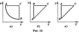 Состояние данной массы газа полностью определено, если известны его давление, температура и объем. Эти величины называют параметрами состояния газа. Уравнение, связывающее параметры состояния, называют уравнением состояния. Для произвольной массы газа состояние газа описывается уравнением Менделеева—Клапейрона: pV = mRT/M, где р — давление, V — объем, m — масса, М — молярная масса, R — универсальная газовая постоянная. Физический смысл универсальной газовой постоянной в том, что она показывает, какую работу совершает один моль идеального газа при изобарном расширении при нагревании на 1 К (R = 8, 31 ДжДмоль • К)). Уравнение Менделеева—Клапейрона показывает, что возможно одновременное изменение трех параметров, характеризующих состояние идеального газа. Однако многие процессы в газах, происходящие в природе и осуществляемые в технике, можно рассматривать приближенно как процессы, в которых изменяются лишь два параметра. Особую роль в физике и технике играют три процесса: изотермический, изохорный и изобарный. Изопроцессом называют процесс, происходящий с данной массой газа при одном постоянном параметре — температуре, давлении или объеме. Из уравнения состояния как частные случаи получаются законы для изопроцессов. Изотермическим называют процесс, протекающий при постоянной температуре. Т = const. Он описывается законом Бойля—Мариотта: pV = const. Изохорным называют процесс, протекающий при постоянном объеме. Для него справедлив закон Шарля: V = const, p/T = const. Изобарным называют процесс, протекающий при постоянном давлении. Уравнение этого процесса имеет вид V/T = const прир = const и называется законом Гей-Люссака. Все процессы можно изобразить графически (рис. 15). Реальные газы удовлетворяют уравнению состояния идеального газа при не слишком высоких давлениях (пока собственный объем молекул пренебрежительно мал по сравнению с объемом сосуда, в котором находится газ) и при не слишком низких температурах (пока потенциальной энергией межмолекулярного взаимодействия можно пренебречь по сравнению с кинетической энергией теплового движения молекул), т. е. для реального газа это уравнение и его следствия являются хорошим приближением.