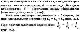 Для накопления значительных количеств разноименных электрических зарядов применяются конденсаторы. Конденсатор — это система двух проводников (обкладок), разделенных слоем диэлектрика, толщина которого мала по сравнению с размерами проводников. Так, например, две плоские металлические пластины, расположенные параллельно и разделенные диэлектриком, образуют плоский конденсатор. Если пластинам плоского конденсатора сообщить равные по модулю заряды противоположного знака, то напряженность между пластинами будет в два раза больше, чем напряженность одной пластины. Вне пластин напряженность равна нулю.