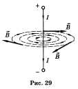 В 1820 г. датский физик Эрстед обнаружил, что магнитная стрелка поворачивается при пропускании электрического тока через проводник, находящийся около нее (рис. 27). В том же году французский физик Ампер установил, что два проводника, расположенные параллельно друг другу, испытывают взаимное притяжение, если ток течет по ним в одном направлении, и отталкивание, если токи текут в разных направлениях (рис. 28). Явление взаимодействия токов Ампер назвал электродинамическим взаимодействием. Магнитное взаимодействие движущихся электрических зарядов, согласно представлениям теории близкодействия, объясняется следующим образом: всякий движущийся электрический заряд создает в окружающем пространстве магнитное поле. Магнитное поле — особый вид материи, который возникает в пространстве вокруг любого переменного электрического поля. С современной точки зрения в природе существует совокупность двух полей — электрического и магнитного — это электромагнитное поле, оно представляет собой особый вид материи, т. е. существует объективно, независимо от нашего сознания. Магнитное поле всегда порождается переменным электрическим, и наоборот, переменное магнитное поле всегда порождает переменное электрическое поле. Электрическое поле, вообще говоря, можно рассматривать отдельно от магнитного, так как носителями его являются частицы — электроны и протоны. Магнитное поле без электрического не существует, так как носителей магнитного поля нет. Вокруг проводника с током существует магнитное поле, и оно порождается переменным электрическим полем движущихся заряженных частиц в проводнике. Магнитное поле является силовым полем. Силовой характеристикой магнитного поля называют магнитную индукцию (В). Магнитная индукция — это векторная физическая величина, равная максимальной силе, действующей со стороны магнитного поля на единичный элемент тока. В = F/IL Единичный элемент тока — это проводник длиной 1 м и силой тока в нем 1 А. Единицей измерения магнитной индукции является тесла. 1 Тл = 1 Н/А • м. Магнитная индукция всегда порождается в плоскости под углом 90° к электрическому полю. Вокруг проводника с током магнитное поле также существует в перпендикулярной проводнику плоскости. Магнитное поле является вихревым полем. Для графического изображения магнитных полей вводятся силовые линии, или линии индукции, — это такие линии, в каждой точке которых вектор магнитной индукции направлен по касательной. Направление силовых линий находится по правилу буравчика. Если буравчик ввинчивать по направлению тока, то направление вращения рукоятки совпадет с направлением силовых линий. Линии магнитной индукции прямого провода с током представляют собой концентрические окружности, расположенные в плоскости, перпендикулярной проводнику (рис. 29). Как установил Ампер, на проводник с током, помещенный в магнитное поле, действует сила. Сила, действующая со стороны магнитного поля на проводник с током, прямо пропорциональна силе тока, длине проводника в магнитном поле и перпендикулярной составляющей вектора магнитной индукции. Это и есть формулировка закона Ампера, который записывается так: Fa = ILВ sin a. Направление силы Ампера определяют по правилу левой руки. Если левую руку расположить так, чтобы четыре пальца показывали направление тока, перпендикуляр