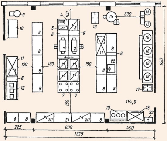 Схема 15. План холодного цеха общедоступной столовой: На крупных предприятиях для приготовления мягкого мороженого устанавливают фризер. Для кратковременного хранения и отпуска мороженого промышленного производства используют низкотемпературный прилавок ПХН-1-0, 4 или низкотемпературную секцию СН-0, 15. Горячий цех занимает в предприятии общественного питания центральное место. В том случае, когда горячий цех обслуживает несколько торговых залов, расположенных на разных этажах, его целесообразно расположить на одном этаже с торговым залом, имеющим наибольшее число посадочных мест. Горячий цех должен быть оснащен современным оборудованием - тепловым, холодильным, механическим и немеханическим: плитами, жарочными шкафами, пищеварочными котлами, электросковородами, электрофритюрницами, холодильными шкафами, а также производственными столами и стеллажами. В зависимости от типа и мощности предусматривается применение в горячем цехе механического оборудования (универсальный привод П-II, машина для приготовления картофельного пюре). Оборудование для горячего цеха подбирают по нормам оснащения торгово-технологическим и холодильным оборудованием в соответствии с типом и количеством посадочных мест в предприятии, режимом его работы, максимальной загрузкой торгового зала в часы пик, а также формам обслуживания. Так, в ресторанах, где первые блюда готовят небольшими партиями, меньше требуется стационарных пищеварочных котлов, чем в столовых, имеющих столько же посадочных мест. В горячем цехе для удобства организации процессов приготовления горячих блюд целесообразно использовать секционное модулированное оборудование, которое можно устанавливать островным способом, или организовывать несколько технологических линий -для приготовления бульонов и первых и вторых блюд; гарниров и соусов (схема 2). [15]