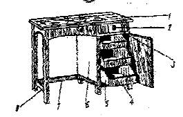 1.) крышка стола 2.) ручка дверцы 3.) лицевая стенка ящика 4.) нижний ящик 5.) боковая стенка ящика 6.) тумба с ящиками 7.) задняя перекладина 8.) боковая перекладина