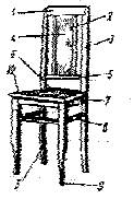 1.) вершник 2.) брусочек 3.) задняя ножка 4.) спинка 5.) задняя ножка 6.) подвязка 7.) царга 8.) проножка 9.) передняя ножка 10.) сиденье