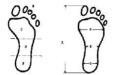 а) пальцы б) плюсна е) ширина плюсневой части в) свод ж) ширина свода г) пяточная часть з) ширина пяточной части д) длина следа