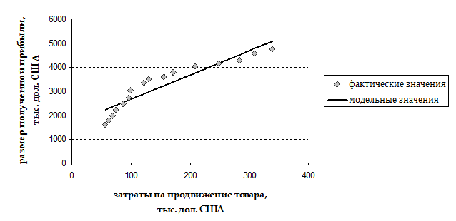 6. Чтобы получить графическую интерпретацию модели, построим в системе координат x0y прямую, которая соответствует полученному уравнению модели. Это будут теоретические (расчетные, модельные) значения зависимой переменной Нанесем также на той же координатной плоскости точки, которые соответствуют исходным, т.е. фактическим данным переменной y. С этой целью используем Мастер диаграмм Microsoft Excel (пункт меню Вставка→ Диаграмма либо пиктограмма Ø Выбираем тип диаграммы – точечная, вид можно оставить по умолчанию, т.е. первый. Ø Нажимаем на кнопку " Далее", переключаемся на вкладку " Ряд" (вкладки расположены вверху окна). Ø В случае, если в поля " Ряд" мастером уже занесены какие-либо данные –очищаем их нажимая на кнопку " Удалить" до тех пор пока она станет неактивной. Ø Нажимаем на кнопку " Добавить" чтобы создать первый ряд данных. Ø В поле " Имя: " вводим с клавиатуры текст фактические значения. Ø В поле " Значения Х: " указываем столбец со значениями х со второй колонки таблицы 1.4 (выделяем диапазон значений мышкой, номер колонки и значение суммы в диапазон не входит!). Ø В поле " Значения Y: " указываем столбец со значениями y с третьей колонки таблицы 1.4 (выделяем диапазон значений мышкой, номер колонки и значение суммы в диапазон не входит!). Ø Нажимаем на кнопку " Добавить" чтобы создать второй ряд данных. Ø В поле " Имя: " вводим с клавиатуры текст модельные значения. Ø В поле " Значения Х: " указываем столбец со значениями х со второй колонки таблицы 1.4 (выделяем диапазон значений мышкой, номер колонки и значение суммы в диапазон не входит!). Ø В поле " Значения Y: " указываем столбец со значениями Ø Нажимаем на кнопку " Далее", вводим с клавиатуры названия для осей Х (затраты на продвижение товара, тыс. дол. США) и Y (размер полученной прибыли, тыс. дол. США). Ø Нажимаем на кнопку " Далее", потом на кнопку " Готово". Ø Форматируем график: нажимаем мишкой на ряд данных с модельными значениями, заходим в меню Формат → Выделенный ряд, в появившемся окне в поле " Линия" ставим переключатель в положение " обычная", а в поле " Маркер" – в положение " отсутствует". Ø Меняем цвета рядов данных, шрифты, заливку области построения, внешний вид линий сетки и осей по собственному усмотрению. Результат представлен на рисунке ниже.