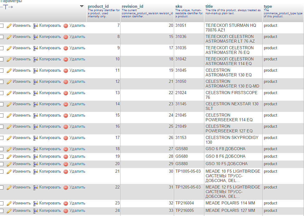 Главной задачей интернет-магазина по продаже оптических телескопов является принятие и оформление заказов на продаваемый товар. Для этого необходимо создать реляционные таблицы, хранящие данные о пользователях, заказывающих товар, включая контактные данные, на наименование и артикул товара, который хотят купить, для того чтобы конкретный пользователь мог выбрать более одного товара за заказ формируется отдельная таблица линейки товаров, последняя таблица будет включать в себя линейки товаров и пользователей. В итоге имеем четыре таблицы для реализации функционала заказа товара: 1. comm_product – таблица, содержащая список всех телескопов на сайте (см Рисунок 10. «Таблица comm_product») 2. comm_line_item – таблица, формирующая линейку товаров (см Рисунок 11. «Таблица comm_line_item») 3. comm_order – таблица, формирующая заказ (см Рисунок 12. «Таблица comm_order») 4. user – таблица содержащая список всех покупателей и хранящая их контактные данные (см Рисунок 13. «Таблица users»)