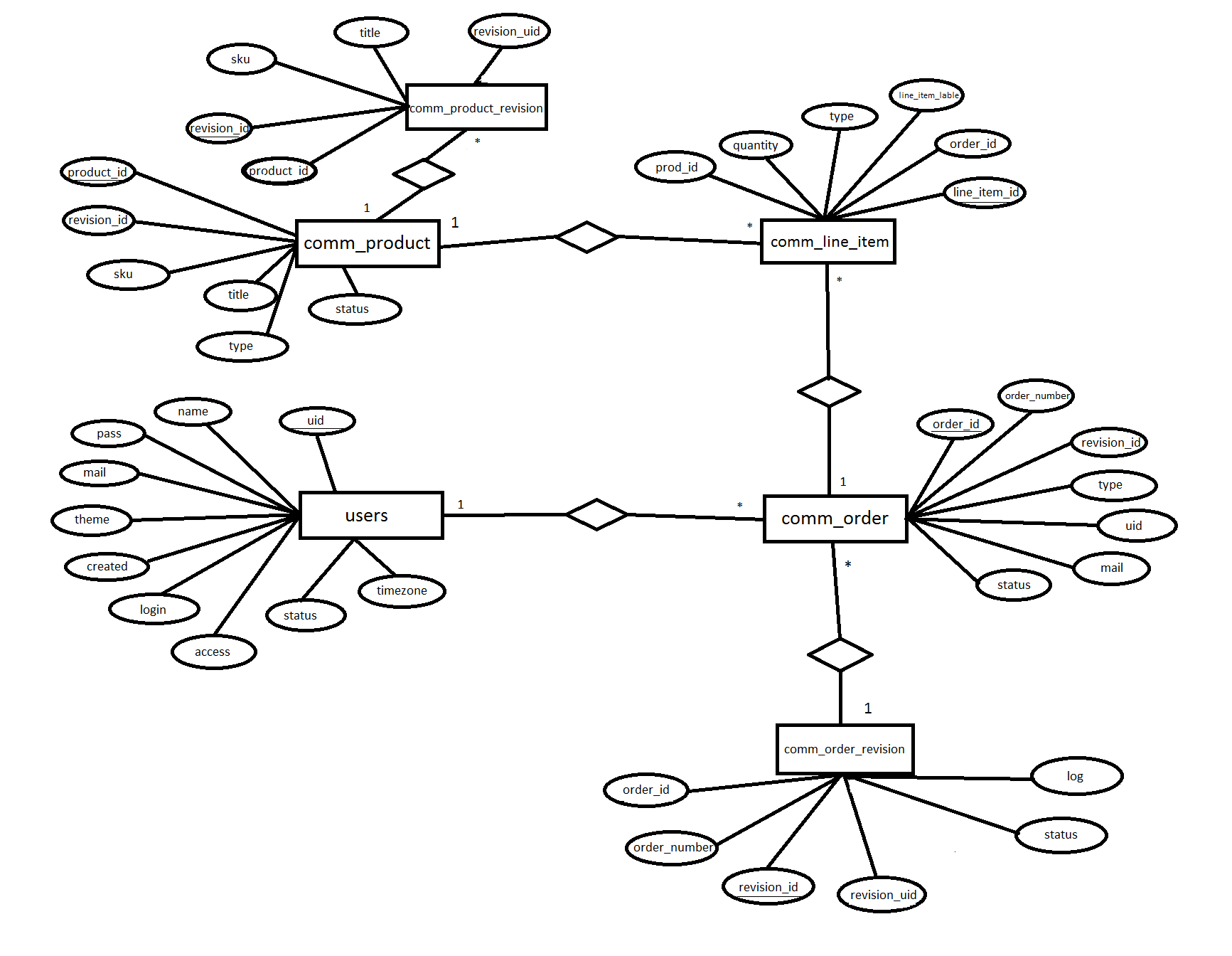 Таблица comm_order_revision записывает хронологию действий покупателя (занесение товара в корзину, заполнение формы с контактными данными, подтверждение покупки). Таблица comm_product_revision записывает хронологию занесения товара в корзину (пользователь может сначала занести один товар, и подумав, далее занести другой товар, или удалить первый).