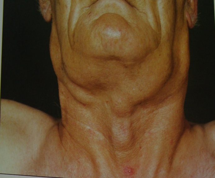 Рис. 1, 2. Хронический лимфолейкоз: двустороннее увеличение шейных и подмышечных лимфоузлов.Больному 65 лет. Гемоглобин 12, 5 мг%; лейкоциты 150× 109/л (лимфоциты 140× 109/л); тромбоциты 120× 109/л (по В. Хоффбранд, Дж. Петит, 2007). Размеры печени и селезенки увеличены в разной степени. Обращает на себя внимание у таких больных одутловатость лица, шум в ушах, цианоз, осиплость голоса, расширение вен грудной клетки, рентгенологически – расширение лимфатических узлов средостения. Общий анализ крови (рис.3): анемия, тромбоцитопения, лейкоцитоз, абсолютный лимфоцитоз.