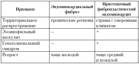 Это наиболее редкая и трудная для диагностики форма кардиомиопатий, характеризуемая выраженным нарушением диастолической функции сердца, которое возникает вследствие фиброзного утолщения эндокарда и вовлечения в патологический процесс подлежащего миокарда. В патогенезе рестриктивной кардиомиопатии (РКМП) важная роль отводится гиперэозинофилии с последующей эозинофильной инфильтрацией миокарда и развитием пристеночных тромбозов. • Классификация: эндомиокардиальный фиброз; пристеночный фибропластический эндомиокардит (Леффлера). Отличительные признаки видов рестриктивной кардиомиопатии приведены в таблице.