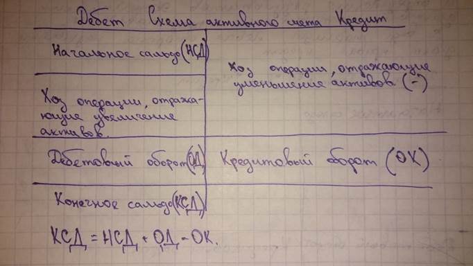 Счет открывается в начале отчетного периода или при необходимости. В нег оиз баланса записывается начальное сальдо (Остаток средств или источников по счету на первое число отчетного периода) Затем в течение месяца на счетах, на основании документально подтвержденных сведений отражается движение средств и источников, рассчитываются дебетовые и кредитовые обороты и выводится конечное сальдо. 10. Активные счета ипользуются для описания хоз средств по составу и размещению. У них дебет означает приход, а кредит – расход.