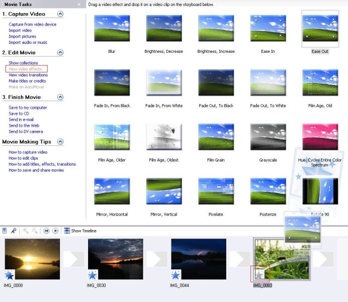 Монітор попереднього перегляду дозволяє проглядати окремі кліпи або весь проект. За допомогою монітора попереднього перегляду можна подивитися проект перед публікацією його як фільму. Кнопки під монітором попереднього перегляду дозволяють відтворювати кліп, припиняти відтворення або виконувати покадрове переміщення по кліпу вперед або назад. Кнопка розділення дозволяє розділити кліп на дві частини по моменту, що відображається на моніторі попереднього перегляду. Крок 1 (Створення проекту). Заходимо і вибираємо File New Project Крок 2 (Завантаження фотографій). У графі Capture video вибираємо Import pictures і завантажуємо фотографії. Крок 3 (Вставка фотографій). Натискаємо кнопку Show Storyboard і перетягувати фотографії на прямокутники. Крок 4 (Додавання відеоефектів). У графі Edit Movie вибираємо View video effects. З'являється вікно (рис. 2.3). У цьому розділі знаходиться безліч відеоефектів. Всі їх можна переглянути. Сподобалися перетягуємо на зображення зірочок (Вибрати можна не обов'язково один фотоефект, просто намести першого ефекту перетягуємо інший). Крок 5 (Додавання переходів). Щоб зробити плавний перехід фотографії з однієї на іншу в графі Edit Movie натискаємо View video transitions. З'являється вікно (рис. 2.4).