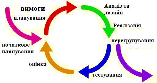 Спіральна модель процесу(86 – 90 рр.) – передбачає послідовність етапів розробки життєвого циклу, яка виконується більше одного разу. Упор розробки робиться на етап «системний аналіз» і проектування. Кожний виток спіралі відповідає створенню фрагмента або версії програмного засобу. На нього уточнюються характеристики проекту і планується робота на наступному витку спіралі. При такому способі робіт буде повне виконання роботи на кожному етапі, але головне надати користувачу найшвидше працездатний продукт.