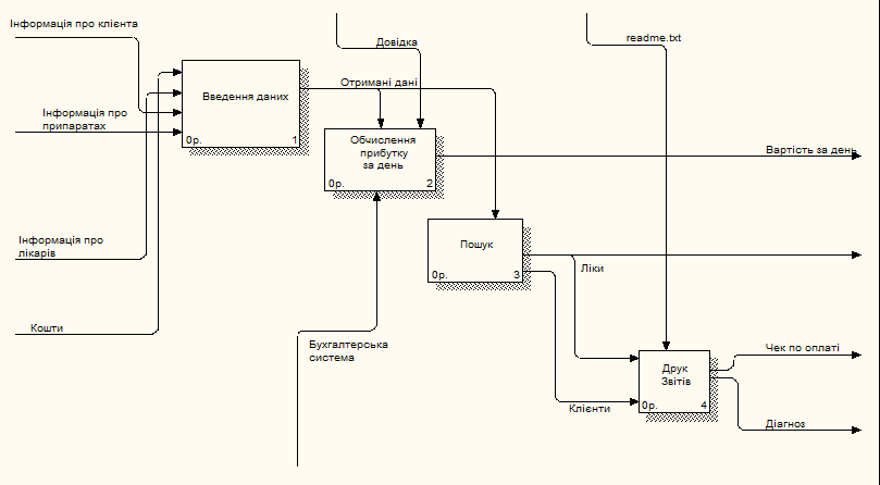 IDEF0 – Діаграма декомпозиції. Дану модель використовують для показу функціональної діяльності системи. Діаграма складається з блоків і стрілок. Функціональна діяльність – її робота(дієслово). Перед тим, як створювати діаграму IDEF0 потрібно визначити: 1. Призначення моделі – це набір питань на які повинна відповідати модель. 2. Границі моделювання (її межі) – це рівень деталізації. 3. Точка зору – вибирається перспектива з якої бачиться система. Дії системи – це функції, вони перетворюють, переробляють вхідні параметри. На діаграмі дії позначаються блоками. Назва дії пишеться всередині блока. Назва функції треба позначати дієсловами. Моделі IDEF0 мають ієрархічну систему. Головний блок система – це контекстна функція, вона може бути декомпозирована (може бути декомпозирована у ряд блоків).