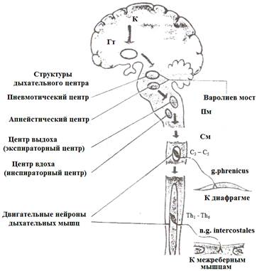Рис.8. Дыхательный центр (его компоненты) и эфферентные нервы. К – кора; Гт – гипоталамус; Пм – продолговатый мозг; См – спинной мозг; Тh1-Тh6 – грудной отдел спинного мозга; С3-С5 – шейный отдел спинного мозга.
