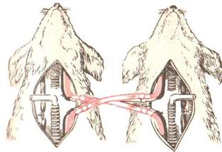 Рис.10. Опыт с перекрестным кровообращением (по Л. Фредерику). Двуокись углерода, водородные ионы и умеренная гипоксия вызывают усиление дыхания. Эти факторы усиливают деятельность дыхательного центра, оказывая влияние на периферические и центральные хеморецепторы, регулирующие дыхание. Роль рефлексогенных зон в регуляции дыхания. Хеморецепторы, чувствительные к увеличению напряжения углекислого газа и к снижению напряжения кислорода находятся в каротидных синусах и дуге аорты. Большее значение для регуляции дыхания имеют каротидные хеморецепторы. При нормальном содержании кислорода в артериальной крови в афферентных нервных волокнах, отходящих от каротидных телец, регистрируются импульсы. При снижении напряжения кислорода частота импульсов возрастает особенно значительно, т.к. гипоксия оказывает на артериальные хеморецепторы стимулирующее влияние. Кроме того, афферентные влияния с каротидных телец усиливаются при повышении в артериальной крови напряжения углекислого газа и концентрации водородных ионов. Хеморецепторы каротидных телец, информируют дыхательный центр о напряжении О2 и СО2 в крови, которая направляется к мозгу. Дыхание зависит от рефлекторных влияний с сосудистых рефлексогенных зоне, и в частности, с барорецепторов зоны позвоночных артерий (ЗПА). В частности, ЗПА вызывает сочетанные изменения дыхания и системного артериального давления. Центральные хеморецепторы расположены в продолговатом мозге, они постоянно стимулируются водородными ионами, находящимися в спинномозговой жидкости. Перфузия этой области мозга раствором со сниженным рН резко усиливает дыхание, а при высоком рН дыхание ослабевает, вплоть до апноэ. То же происходит при охлаждении или обработке этой поверхности продолговатого мозга анестетиками. Центральные хеморецепторы, оказывая сильное влияние на деятельность дыхательного центра, существенно изменяют вентиляцию легких. Центральные хеморецепторы реагируют на изменение напряжения СО2 в артериальной крови позже, чем периферические хеморецепторы, так как для диффузии СО2 из крови в спинномозговую жидкость и далее в ткань мозга необходимо больше времени. Гиперкапния и ацидоз стимулируют, а гипокапния и алкалоз – тормозят центральные хеморецепторы. Импульсы, поступающие от центральных и периферических хеморецепторов, являются необходимым условием периодической активности нейронов дыхательного центра и соответствия вентиляции легких газовому составу крови. Своеобразие функции внешнего дыхания состоит в том, что она одновременно и автоматическая, и произвольно управляемая.