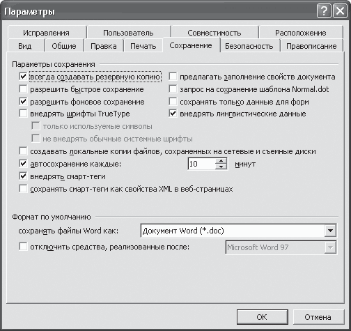 Рис. 2. Окно сохранения документа При написании курсовой или дипломной работы удобнее всего сохранять каждый раздел в отдельном файле, а потом с помощью инструментов работы с большими документами редактора Word, о которых поговорим позже, собрать все отдельные части в один файл. Сохранять файл рекомендуется не только в конце работы, но и время от времени, после того как вы набрали несколько абзацев. Это убережет от потери данных в случае сбоев. Хранение резервных копий. В Word можно включить режим автоматического сохранения версии документа при каждом его закрытии. Это бывает полезно, если необходимо фиксировать информацию о том, кто и когда вносил исправления – например, если это юридический документ. Сделать это можно, установив флажок «Автоматически сохранять версию при закрытии» в окне Версии документа. Кроме сохранения версий, в текстовом редакторе Word можно сохранять резервные копии документа. Важность этой функции сложно переоценить, ведь резервные копии надо создавать в любом случае, причем лучше держать их на разных носителях информации, чтобы обезопасить себя от потери данных. Возможность создания резервной копии стандартными средствами Word позволяет в любой момент восстановить предыдущую копию документа. Если по какой-то причине изменения в вашем документе не были сохранены, вы сможете восстановить хотя бы некоторые из них, воспользовавшись этой функцией программы. Для этого выполните команду Сервис > Параметры, на закладке Сохранение установите флажок всегда создавать резервную копию (рис. 3).