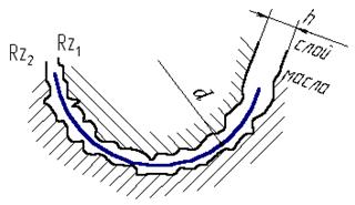 Рис. 1.9. Схема контакта шероховатых поверхностей в условиях жидкостного трения. Для того чтобы между трущимися поверхностями мог длительно существовать масляный слой, в нем должно быть избыточное давление, которое самовозникает в слое жидкости при вращении цапфы (гидродинамическая смазка) (рис.1.12.) или создается насосом (гидростатическая смазка) (рис.1.11). Гидростатический способ: