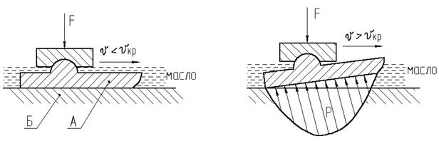Рис. 1.12. Принцип гидродинамического трения Две пластины А и Б, залитые маслом и нагружены силой F. ПластинаА движется относительно пластины Б со скоростью V. Если V мала, то пластина А выжимает смазку с пластины Б.Пластины соприкасаются, - полужидкостное трение (рис.1.12.). При достаточно большой скорости V пластина А поднимается в масляном слое и принимает наклонное положение (как водные лыжи или глиссер, скользящие по воде). Между пластинами образуется сужающийся зазор. Вязкое и липкое масло непрерывно нагнетается в зазор. Подпитка масла через сужающийся зазор сопровождается образованием давления Р, которое уравновешивает внешнюю нагрузку. Этот переход к жидкостному трению, происходящий при некоторой скорости, называется критической VКР. Гидродинамическая теория смазки доказывает, что гидродинамическое давление может развиваться только в сужающемся зазоре, который принято называть клиновым. В радиальных подшипниках клиновая форма зазора свойственна самой конструкции подшипника. Он образуется за счет смещения центров цапфы вала и вкладыша. (Рис.1.11.). Положение цапфы в состоянии покоя и относительного движения при жидкостном трении: S=D-d - диаметральный зазор в состоянии покоя; ε –абсолютный эксцентриситет, ω - угловая скорость вала, Жидкий смазочный материал подается только в зону низкого давления, откуда вращается цапфой направляется вниз, в зазор, образуя клиновидный поддерживающий клин. При угловой скорости ω > ω крцапфа всплывает в масле и несколько смещается в сторону вращения. С увеличением ω увеличивается толщина разделяющего масляного слояhmin , а- центр цапфы сближается с центром вкладыша. При ω Исследования показывают, что
